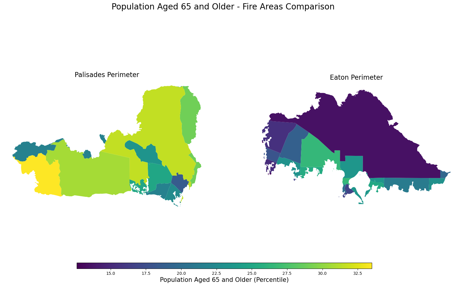 # Create blank figure with two subplots side by sidefig, (ax1, ax2) = plt.subplots(1, 2, figsize=(20, 10))# Specify the EJI variable to ploteji_variable ='E_AGE65'# Find common min/max for legend rangevmin =min(eji_pali[eji_variable].min(), eji_eaton[eji_variable].min())vmax =max(eji_pali[eji_variable].max(), eji_eaton[eji_variable].max())# Plot census tracts within Palisades perimetereji_pali.plot( column= eji_variable, vmin=vmin, vmax=vmax, legend=False, ax=ax1,)ax1.set_title('Palisades Perimeter', fontsize=16)ax1.axis('off')# Plot census tracts within Eaton perimetereji_eaton.plot( column=eji_variable, vmin=vmin, vmax=vmax, legend=False, ax=ax2,)ax2.set_title('Eaton Perimeter', fontsize=16)ax2.axis('off')# Add overall titlefig.suptitle('Population Aged 65 and Older - Fire Areas Comparison ', fontsize=20)# Add shared colorbar at the bottomsm = plt.cm.ScalarMappable( norm=plt.Normalize(vmin=vmin, vmax=vmax))cbar_ax = fig.add_axes([0.25, 0.08, 0.5, 0.02]) # [left, bottom, width, height]cbar = fig.colorbar(sm, cax=cbar_ax, orientation='horizontal')cbar.set_label('Population Aged 65 and Older (Percentile)', fontsize=15)plt.show()