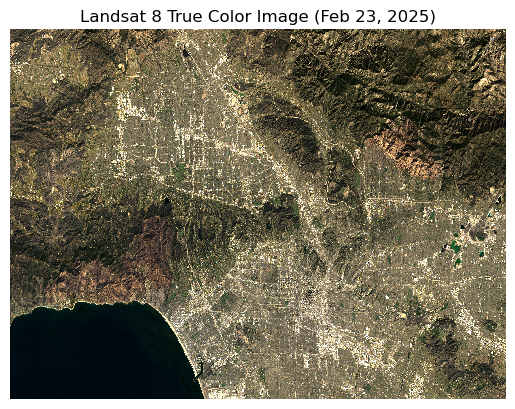 Before analyzing the fire impact, we will create a true color composite image using the red, green, and blue bands from the Landsat dataset. This composite will provide a visual representation of true colors as seen by the human eye of the area affected by the Eaton and Palisades fires.