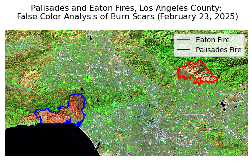 This figure displays a false color composite image of the Los Angeles County fires using SWIR, NIR, and red bands assigned to RGB channels, respectively, to highlight the burned areas from the Palisades and Eaton fires. The imagery was acquired by Landsat 8 on February 23, 2025.