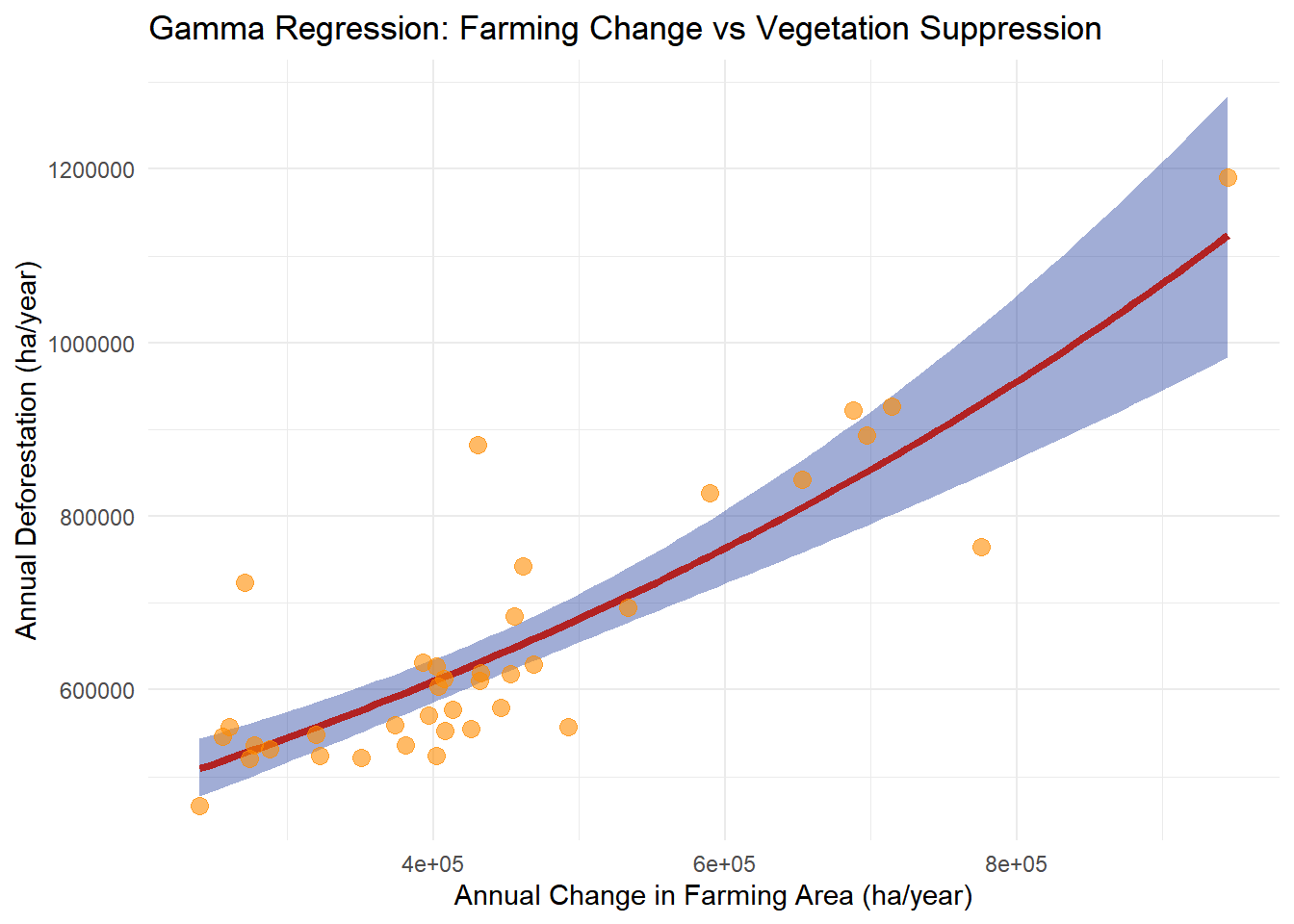 title = "Gamma Regression: Farming Change vs Vegetation Suppression",