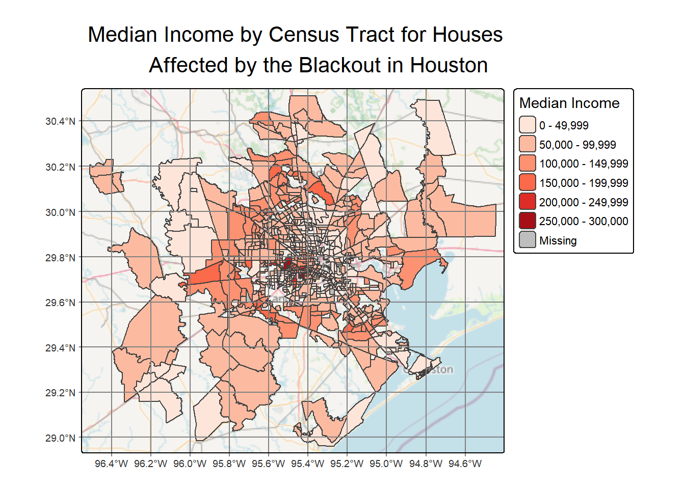 # Verify that both datasets use the same CRS and add a stop error if they don'tif(st_crs(houston_income) !=st_crs(homes_blackout)){stop("coordinate reference systems must match to join datasets")}# Intersect census tracts with blackout areashomes_census_blackout <- houston_income[homes_blackout, op = st_intersects]# Create map showing median income for blackout-affected census tractstm_shape(homes_census_blackout) +tm_fill(col ="B19013e1",palette ="Reds", title ="Median Income") +tm_basemap(server ="OpenStreetMap", alpha =0.7) +tm_graticules() +tm_title(text ="Median Income by Census Tract for Houses Affected by the Blackout in Houston" )