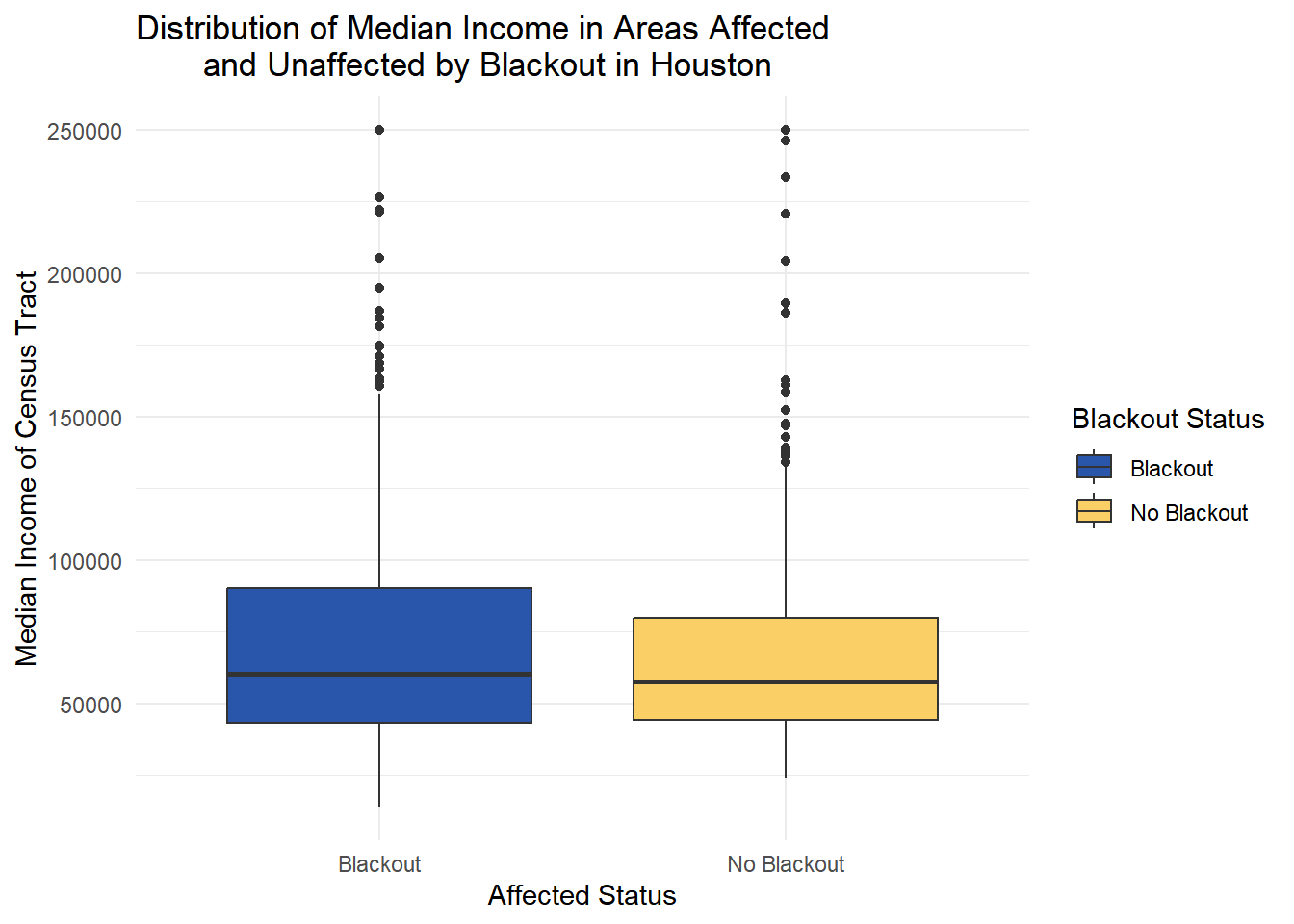 The boxplot reveals similar income distributions between areas that experienced blackouts and those that did not. The yellow box representing unaffected areas shows a slightly lower median income compared to the blue box representing blackout-affected census tracts.