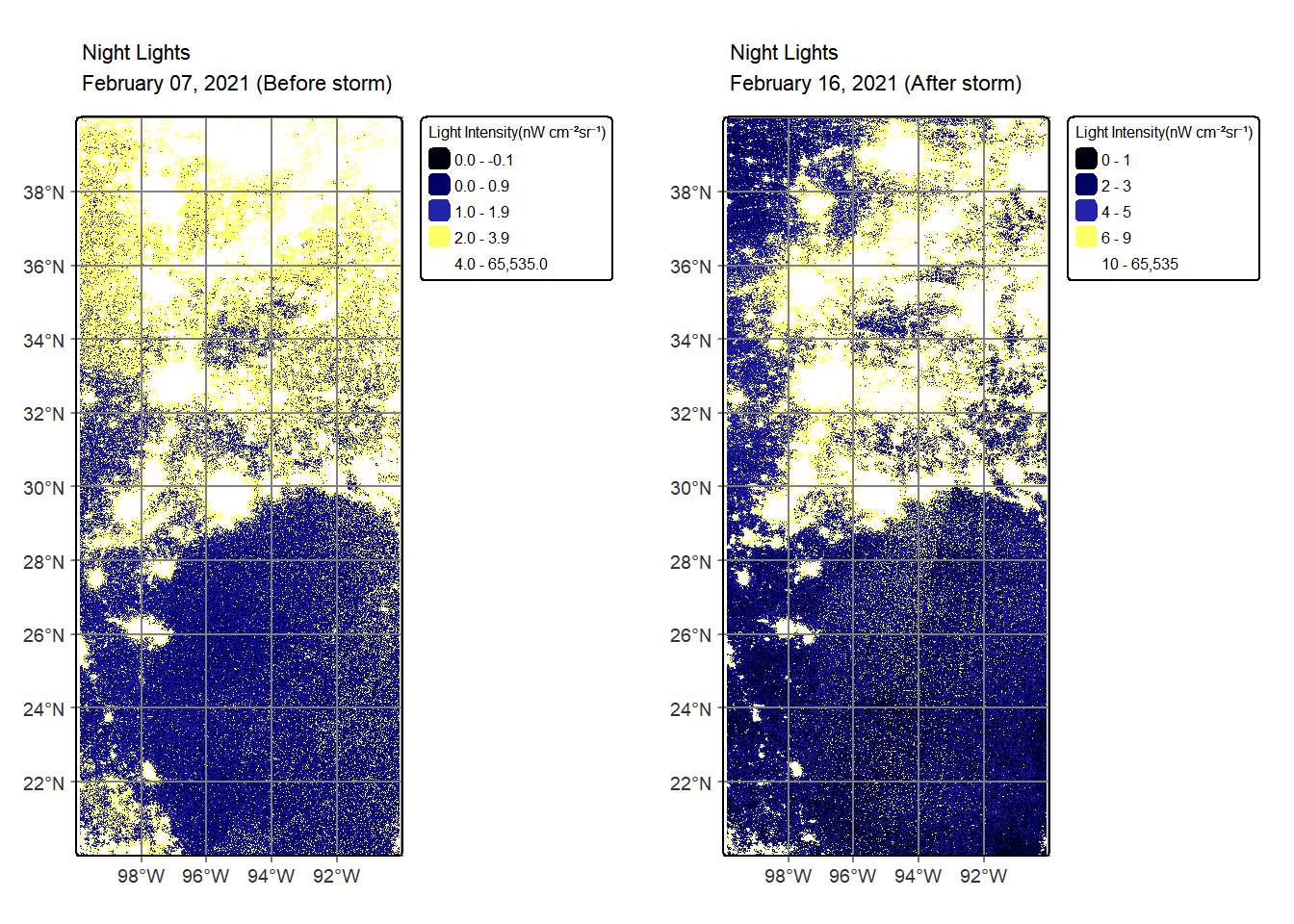 # Merge tiles from February 7, 2021mosaic_7 <-st_mosaic(rt_0705, rt_0706)# Merge tiles from February 16, 2021mosaic_16 <-st_mosaic(rt_1605, rt_1606)# Create color palette for the night lightspal_lights <-c("#000011", "#000066", "#2222AA", "#FFFF66", "#FFFFFF")# Plot raster of night lights before the stormsmap_before <-tm_shape(mosaic_7) +tm_raster(palette = pal_lights,style ="quantile", title ="Light Intensity(nW cm⁻²sr⁻¹)") +tm_title(text ="Night Lights\nFebruary 07, 2021 (Before storm)", size =0.7)+tm_graticules()+tm_layout(inner.margins =c(0.001, 0.001, 0.001, 0.001),component.autoscale =FALSE,legend.text.size =0.5,legend.title.size =0.5,)# Plot raster of night lights after the stormsmap_after <-tm_shape(mosaic_16) +tm_raster(palette = pal_lights,style ="quantile", title ="Light Intensity(nW cm⁻²sr⁻¹)") +tm_title(text ="Night Lights\nFebruary 16, 2021 (After storm)", size =0.7)+tm_graticules() +tm_layout(inner.margins =c(0.001, 0.001, 0.001, 0.001),component.autoscale =FALSE,legend.text.size =0.5,legend.title.size =0.5,)tmap_arrange(map_before, map_after, nrow =1)