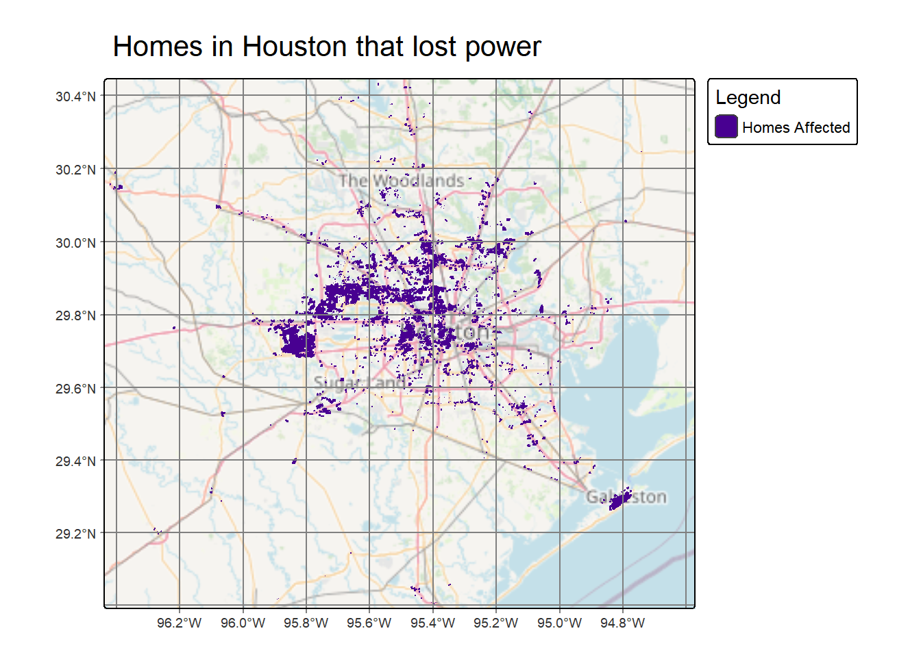 # Plot a map of homes affected by the blackoutmap_homes_blackout <-tm_shape(homes_blackout) +tm_polygons(col ="#480091") +tm_title(text ="Homes in Houston that lost power") +tm_graticules() +tm_basemap("OpenStreetMap", alpha =0.7) +tm_layout(inner.margins =c(0.01, 0.01, 0.01, 0.1),component.autoscale =FALSE) +tm_add_legend(type ="fill",labels ="Homes Affected",col ="#480091",title ="Legend")map_homes_blackout